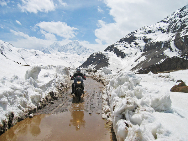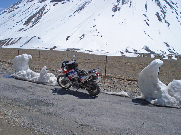 Durch die Schneeschmelze waren einige tiefe Wasserpassagen zu bewältigen und manchmal wurde die Straße von mächtigen Schneebrettern sehr verschmälert.