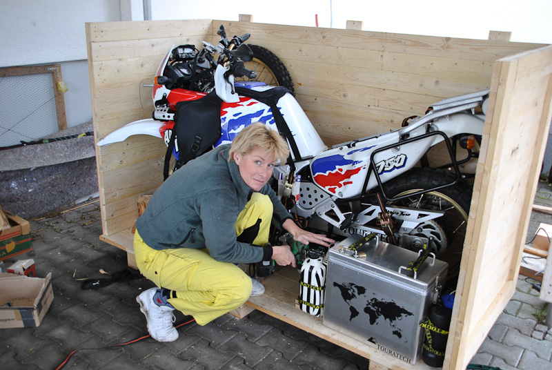 Doch diesmal war Konnis Highlight in der Vorbereitungsphase perfekt. Mister Tollpatsch purzelte so genial durchs Leben, dass er sich gleich eine Fraktur des Schulterdaches zuzog, die nirgendwo klassifiziert ist. Über diese Verletzung staunten die Ärzte genauso wie ich und mein Kollege Hansi gab alles, um Konni so schnell wie möglich wieder fit zu machen. Doch ein Knochenbruch im Schulterbereich braucht Zeit und kann sehr tückisch sein. Deshalb waren die letzten Wochen vor dem Flug schon eine kleine Zitterpartie. Konni durfte seine Schulter nicht belasten; daher waren wir stets auf die Kraft von Dieter Gorbach und unserer Nachbarn Tom Belli und Andreas Bunz angewiesen, um die Motorräder für den Transport vorzubereiten. Mit gemeinsamen Kräften haben wir es letztendlich doch geschafft, die Bikes und das Gepäck in den Transportkisten zu platzieren und reisefertig zu machen.