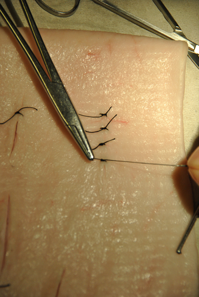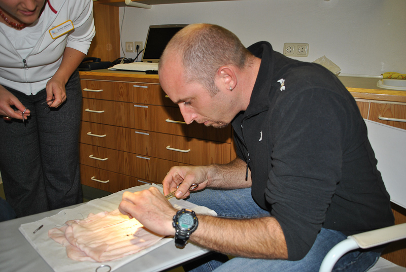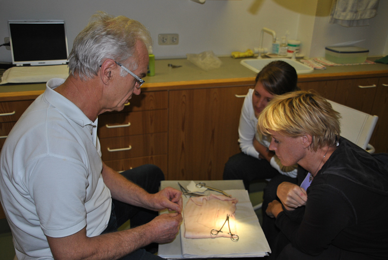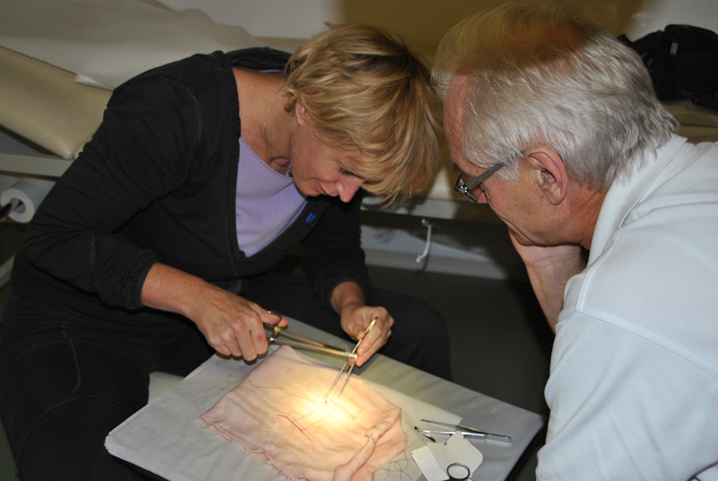 Dr. Geitner aus Ottbeuren führte Konni und mich in die Grundlagen der Chirugie ein. An einer Speckschwarte lernten wir das Nähen von Wunden. Zu Beginn war es schon eine Überwindung und ein kleiner Kraftakt die Nadel durch das zähe Gewebe zu stechen, doch mit der Zeit klappte das Handling mit den Instrumenten immer besser und unsere Knoten wurden fast perfekt. Ich hatte richtig Spaß dran und überlegte laut was ich auf unserer Tour alles anstellen müsste, um Konni eine Wunde zuzufügen, damit ich nähen kann.