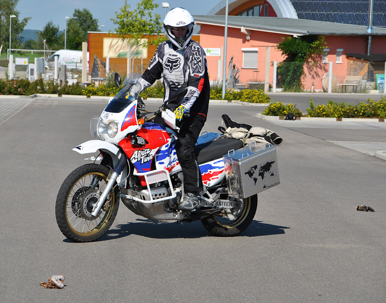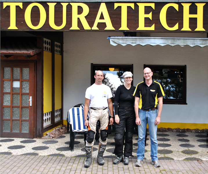 Nachdem die grobe Planung bereits begonnen hatte, haben Konni und ich uns zuerst der Großbaustelle „Africa Twin“ angenommen. Meine alte Lady wurde von Touratech mit so viel neuem Equipment ausgestattet, dass sie mir schon fast unheimlich war. Nachdem ich mich davon überzeugt hatte, dass es sich immer noch um das Selbe Motorrad handelte, statteten wir dem Herzstück von Touratech in Niedereschach einen Besuch ab, wo wir mit Joe Stather viel Spaß hatten. „JoeDakar Stather „ hat uns auch gleich mit seinem noch nicht erschienenen Kochbuch „On the Boil“ ausgestattet. Wir mussten ihm versprechen einiges daraus auszuprobieren und Beweisfotos zu machen. Dieses Versprechen werden wir natürlich halten – und Joe:“Wehe es schmeckt nicht!“