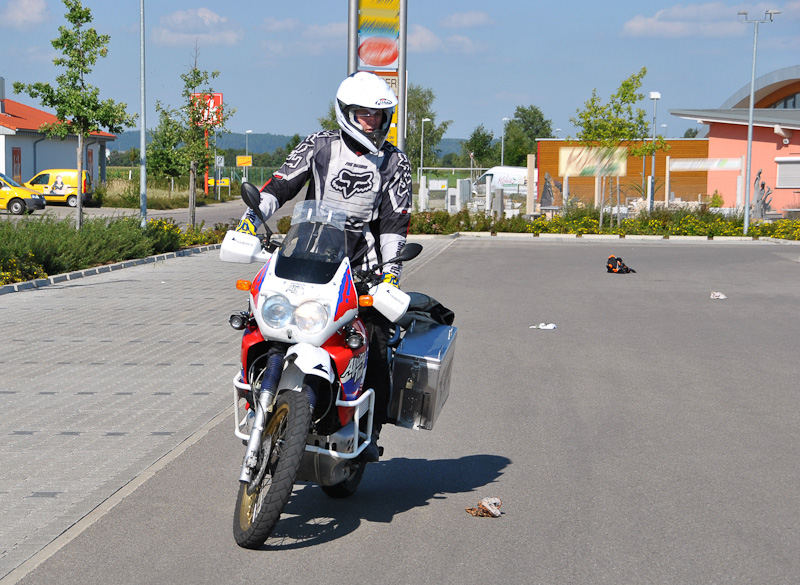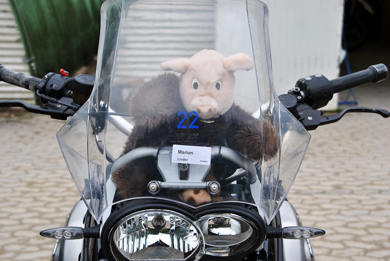 Diesen Triumph konnte ich meinem inneren Schweinehund einfach nicht gönnen, daher übte ich freiwillig wie eine Besessene in der brütenden Hitze von 32 Grad auf einem Parkplatz Blickführung und beschloss mich meiner Angst nochmals zu stellen und weitere zwei Tage in Hechlingen zu trainieren. Diesmal fuhr ich allerdings nicht alleine in die „Höhle des Löwen“. Ich nahm meinen verstofftierten Schweinehund mit und ließ ihn mit Kabelbinder vom Hechlinger Meisterschrauber Gerd direkt hinter dem Windschild befestigen. Bis ich realisierte, dass Gerd meinen Begleiter an einer 1200 GS befestigte, war jede Widerrede zwecklos.