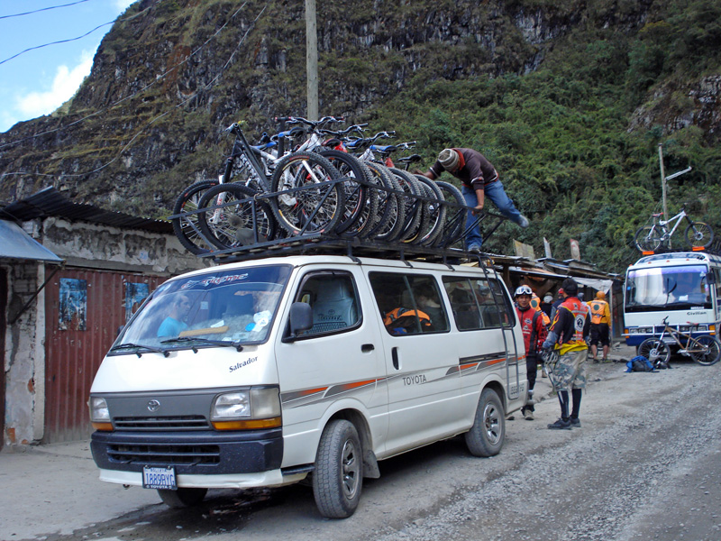 Am Police-Check-Point wurden die Bikes kurz wieder aufs Dach des Transporters gespannt, um die 8km bergauf zu überbrücken. In unserer Gruppe bestand ganz kurz die Überlegung die Strecke hoch zu radeln, aber mit einem Downhill-Bike, in dieser Höhe…. Nö, dann lieber doch den bequemen Weg. Also alle rein ins Auto.