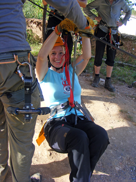 Wir wurden an eine Rolle gehängt, die mit einer bolivianischen Bremse ausgestattet war – was uns zuerst etwas skeptisch in die Landschaft blicken ließ. Diese Rolle sauste mit uns über 3 Schluchten, wovon eine 9% Gefälle aufwies (in Europa sind max. 6% Gefälle zu finden, daher zählt die Zip-Line in Bolivien zu den steilsten und schnellsten der Welt). Wir erreichten Geschwindigkeiten bis über 80 km/h. Die bolivianischen Bremsen funktionierten übrigens hervorragend!