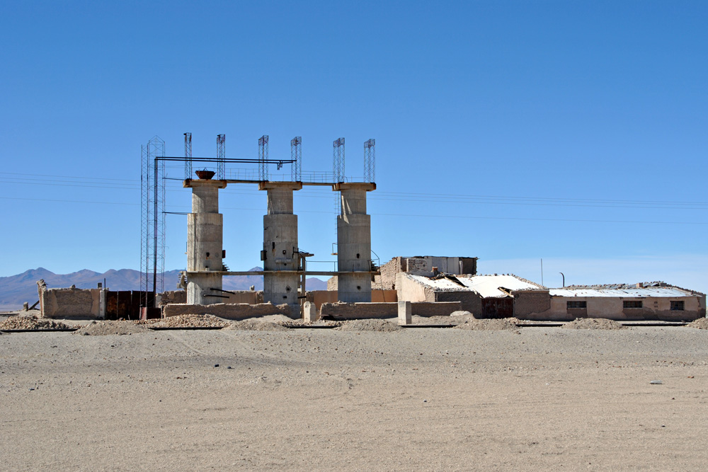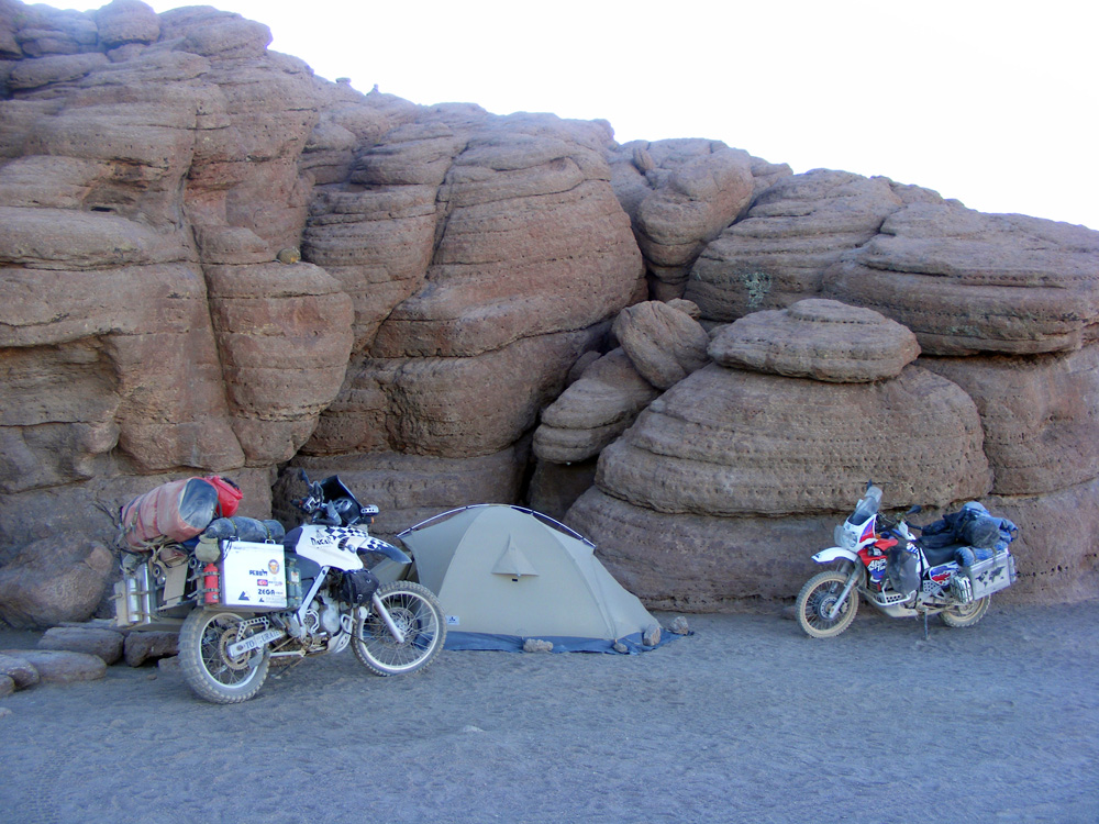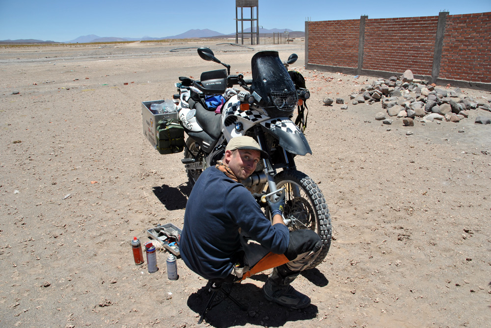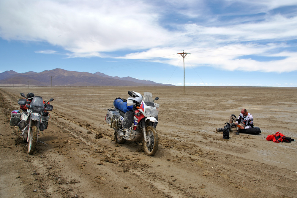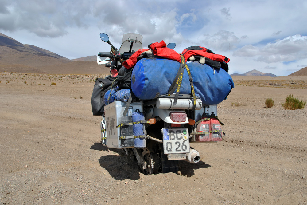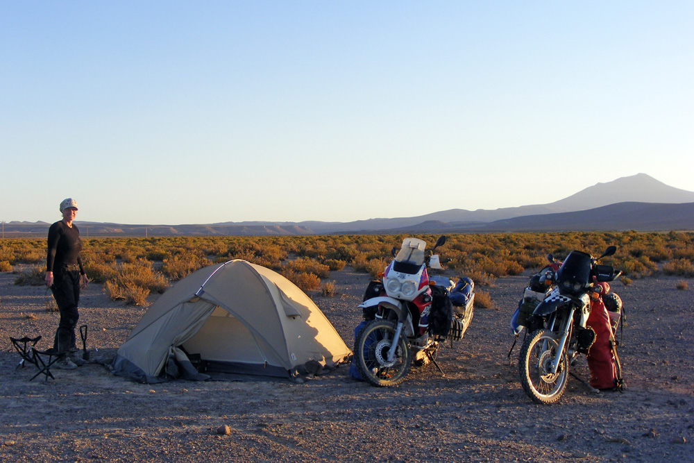 Am späten Nachmittag erreichten wir Julaca , um festzustellen, dass es hier unmöglich war Sprit zu bekommen. Dieser Ort war wie ausgestorben! Also fuhren wir weitere 30 km in Richtung Rio Grande. Hier fragten wir uns durch und erhielten von einem Privatmann 30 l Benzin. Der bolivianische Wucherpreis war uns heute auch noch total egal. An einem kleinen Lebensmittelladen deckten wir uns mit reichlich Wasser und Futter ein und steuerten direkt hinter eine Mauer. Wir waren so kaputt, dass wir keinen Meter mehr weiter fahren wollten – wir hätten es auch nicht gekonnt. Da machte uns der umherliegende Müll auch nichts mehr aus. Wir stellten einfach das Zelt auf. Während dem essen schauten wir traurig unsere Bikes an. Sie sahen furchterregend aus!