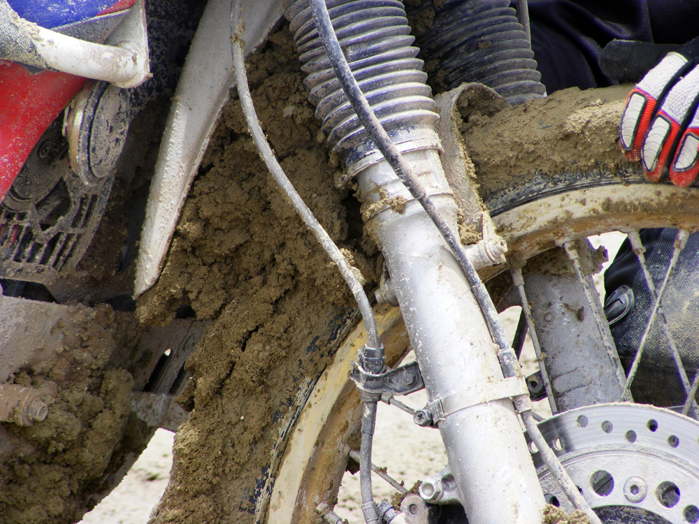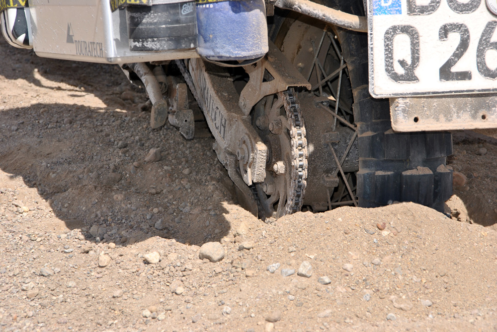 Der Untergrund wurde immer schwerer zu befahren, da der Matsch wie zäher Kaugummi an den Bikes kleben blieb. Wir kamen nur Zentimeterweise voran, da wir alle 3 Meter stehen bleiben mussten, um mit Reifenhebern die Lauffreiheit der Raeder wieder gewährleisten zu können. Konni und ich legten immer im Wechsel die Motorräder auf die Seite. Ich war irgendwann so auf mich konzentriert, dass ich nicht mehr sah was Konni machte – bis ich ihn schreien hörte.