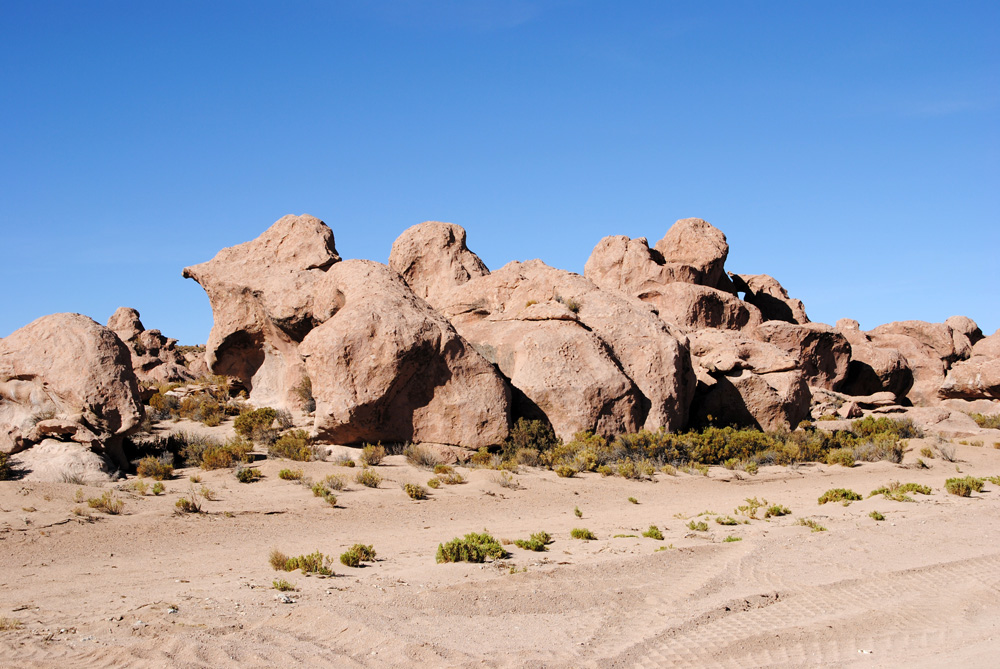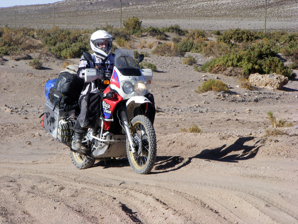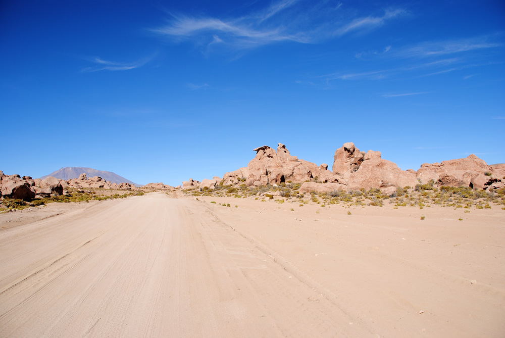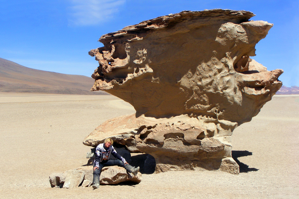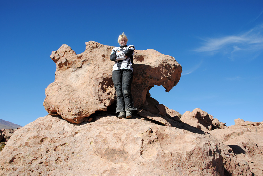 Es ging zuerst gute 60 Kilometer über eine genial platt gewalzte Piste Richtung Westen, um dann den Kurs an der chilenischen Grenze in Richtung Süden einzuschlagen. Ab hier wurde es wieder harte körperliche Arbeit. Wir kämpften uns dann noch 65 km durch das grob von Jeeps verspurte sandige Gelände und mussten dann gute 40 km vor der Laguna Colorada im Windschutz bizarrer Felsen und in einer Höhe von 4601 m unser Zelt aufschlagen. Unter neugierigen Blicken eines kleinen possierlichen hasenähnlichen Tierchens kochten wir weitere Konservendosen.