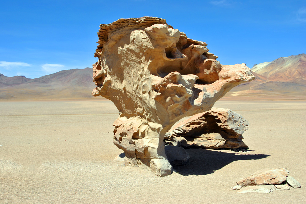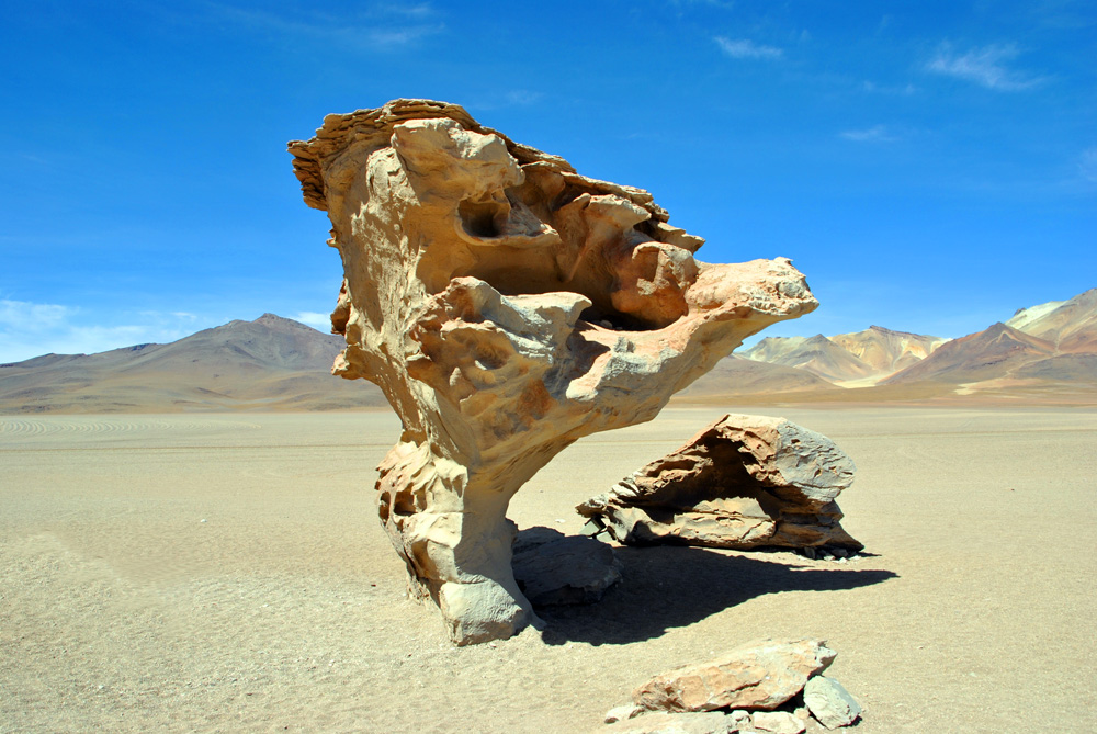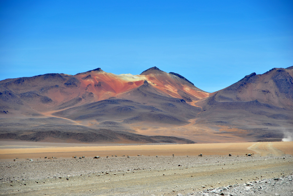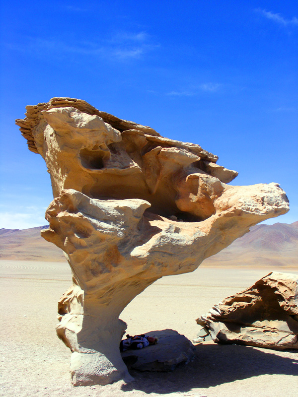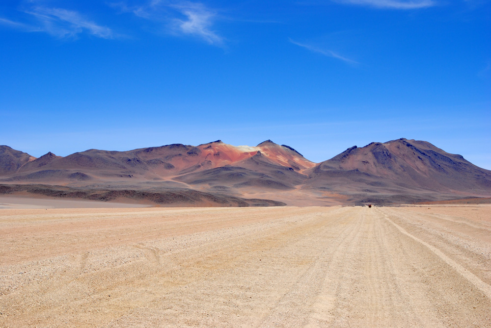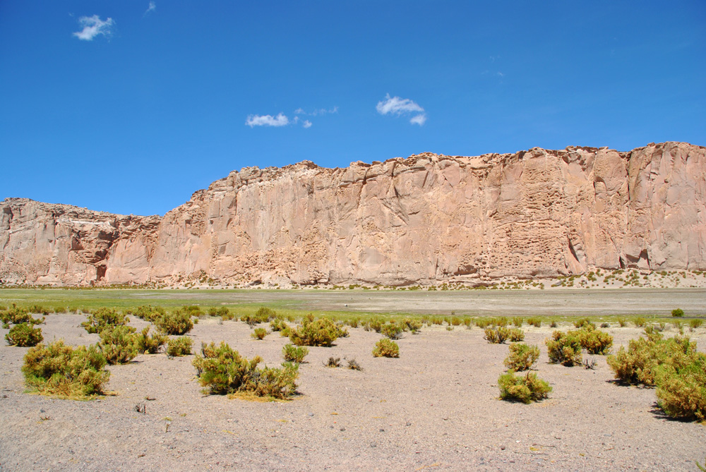 Es ging zuerst gute 60 Kilometer über eine genial platt gewalzte Piste Richtung Westen, um dann den Kurs an der chilenischen Grenze in Richtung Süden einzuschlagen. Ab hier wurde es wieder harte körperliche Arbeit. Wir kämpften uns dann noch 65 km durch das grob von Jeeps verspurte sandige Gelände und mussten dann gute 40 km vor der Laguna Colorada im Windschutz bizarrer Felsen und in einer Höhe von 4601 m unser Zelt aufschlagen. Unter neugierigen Blicken eines kleinen possierlichen hasenähnlichen Tierchens kochten wir weitere Konservendosen.