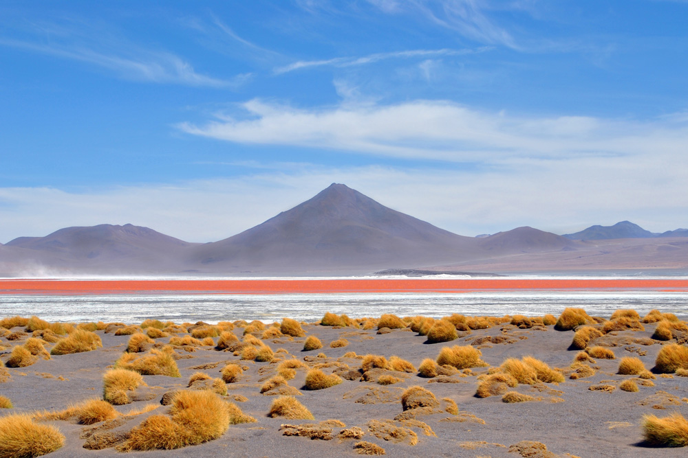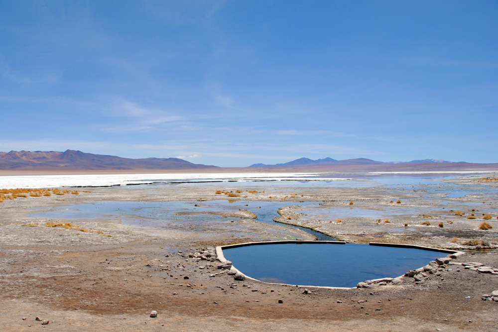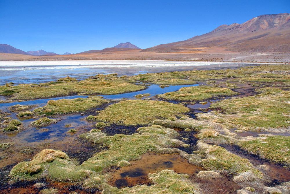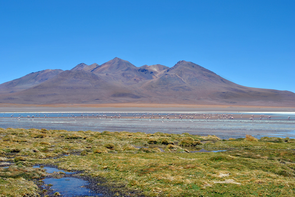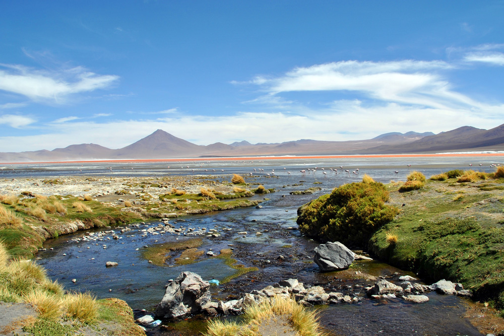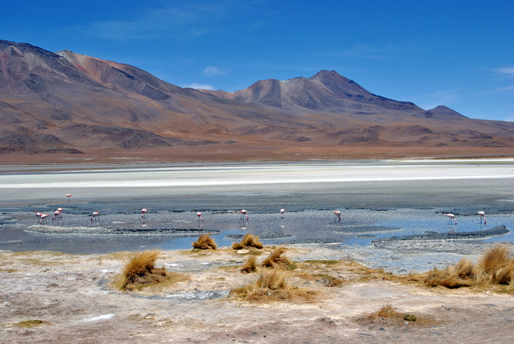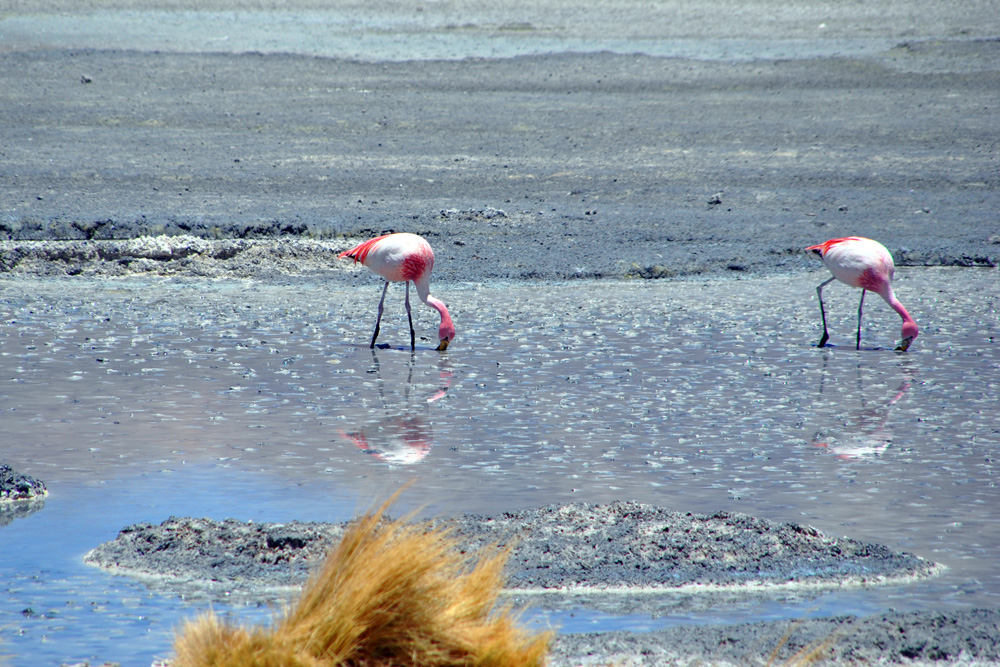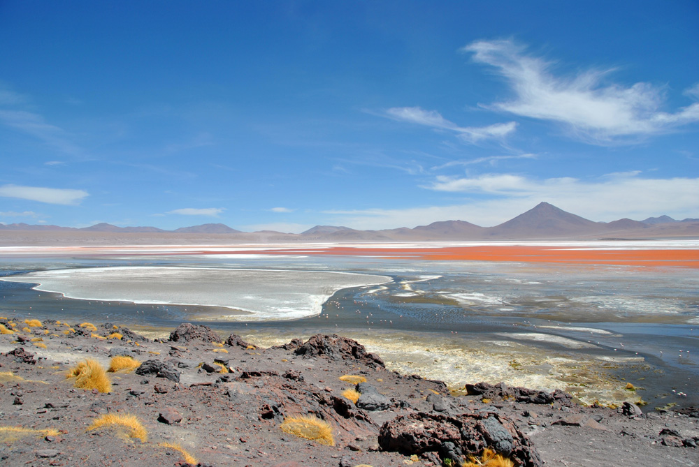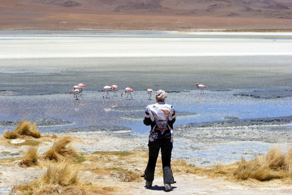 An der Laguna Colorada weigerte sich Konni auch nur einen Meter weiterzufahren und so bezogen wir das hiesige Hotel – unser Zelt wäre wesentlich sauberer und gemütlicher gewesen, aber was soll´s. Am Nachmittag wanderten wir etwas um die Lagune herum und erfreuten uns an der roten Farbe und dem tollen Ausblick.
