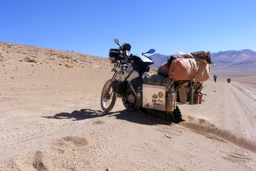 Ich hob den Kopf und sah, dass er sich in einer sehr unbequemen Lage befand und sich die Lunge aus dem Hals schrie. Ich befürchtete das Schlimmste! “Nicht die Schulter, lass es nicht die Schulter und auch nicht irgend etwas anderes sein”! Ich legte mein Motorrad ab und rannte so schnell, wie es auf einer Höhe von 3845 m in Motorradstiefeln und 10 cm Kaugummimatsch unter den Sohlen ging, zu ihm. Sein Knöchel war direkt unter der Kofferkante eingeklemmt.