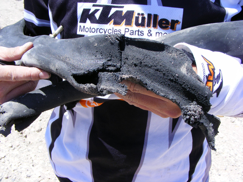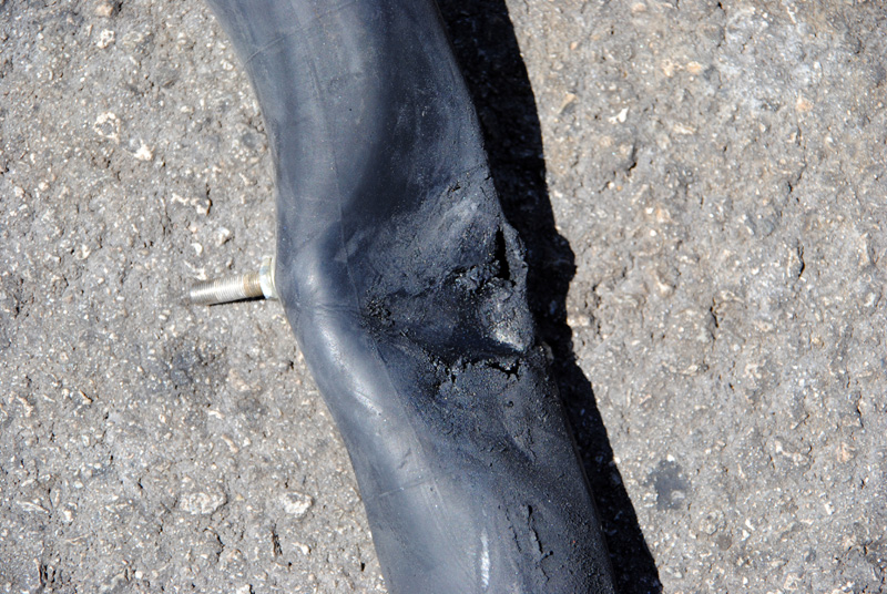 Wir entfernten so gut es ging die geschmolzenen Gummireste aus dem Mantel und machten sie mit Sandstaub weniger klebrig, fixierten das gerissene Felgenband mit Panzertape und legten einen neuen Schlauch ein. Währenddessen sparte Konni nicht mit Belehrungen was hätte alles passieren können – alter Klugscheißer!