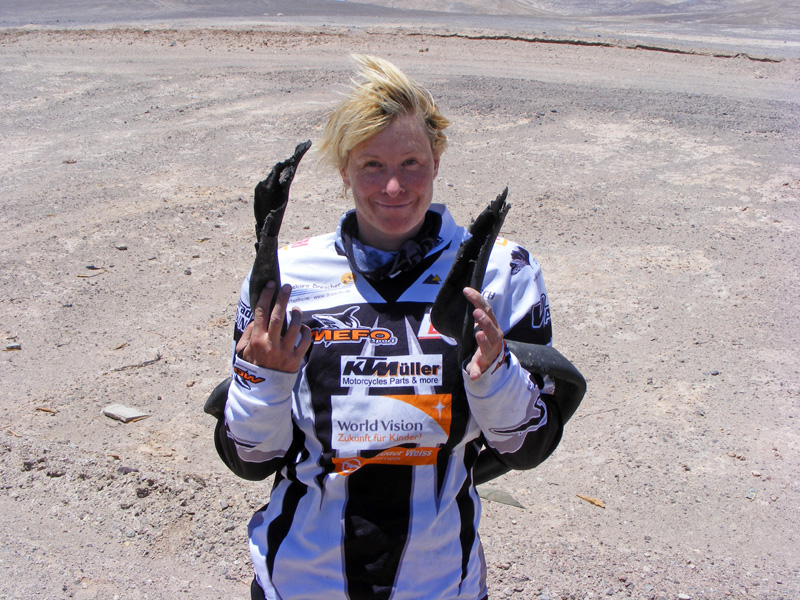 Wir machten noch kurz Beweisfotos des geschmolzenen Schlauches und hinterließen ihn in der Atacama-Wüste. Peinlich ist noch, dass ich keine 24 Stunden vorher gelästert habe, dass am Straßenrand alle 300m ein zerfetzter LKW-Reifen liegt. Nun gibt es auch eine kleines Andenken von mir. Ich werde nie wieder lästern!
