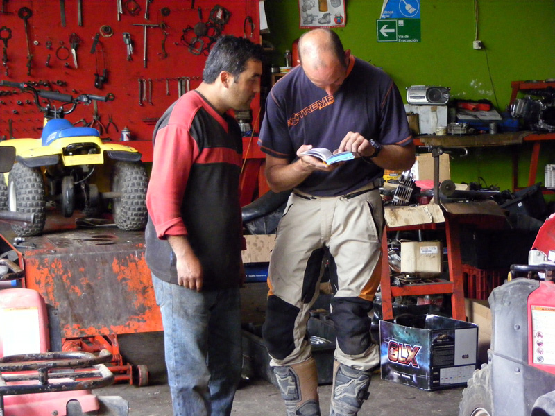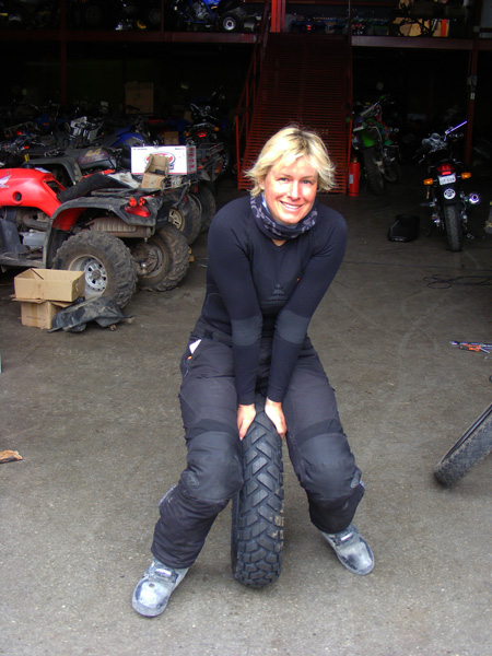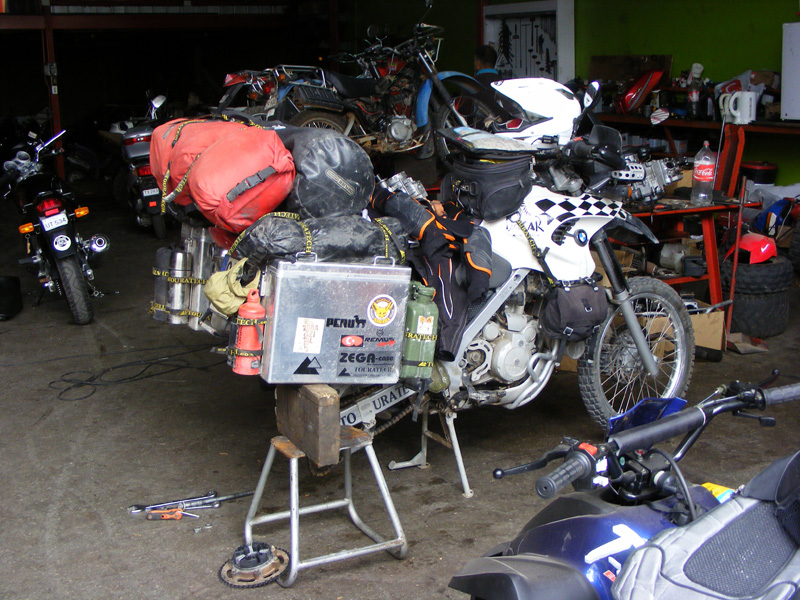 Bevor wir unseren Weg fortsetzten steuerten wir eine Motorradwerkstatt an, um einen neuen Reserveschlauch und Kettenspray zu organisieren. Dabei stolperten wir auch gleich über sehr brauchbare Reifen und kauften die gleich noch dazu. Ganze 3 Std verbrachten wir in diesem Laden und hatten mit den Mechanikern jede Menge Spaß, die auch gleich noch Konni eine Ersatz-Distanzhülse bastelten.