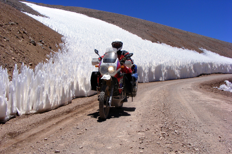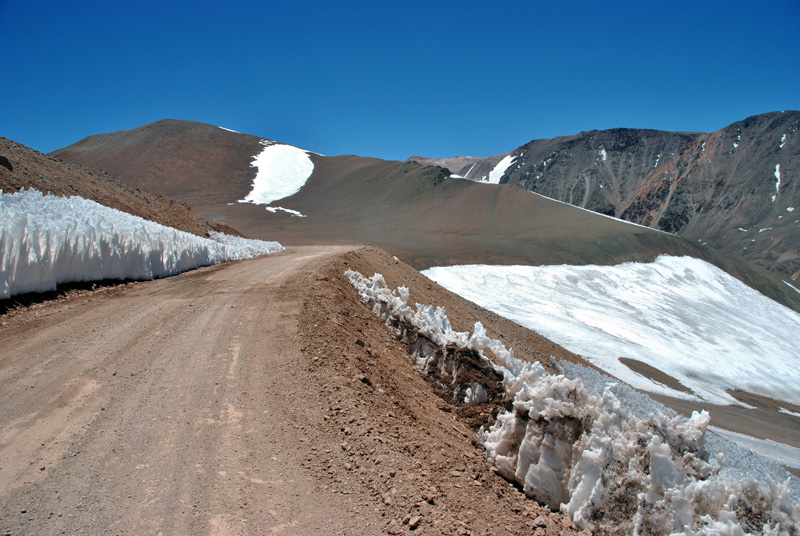 Auf der argentinischen Seite erwarteten uns einige bizarre Schneefelder, die zwar zum eisigen Wind passten, aber nicht zur restlichen Landschaft.