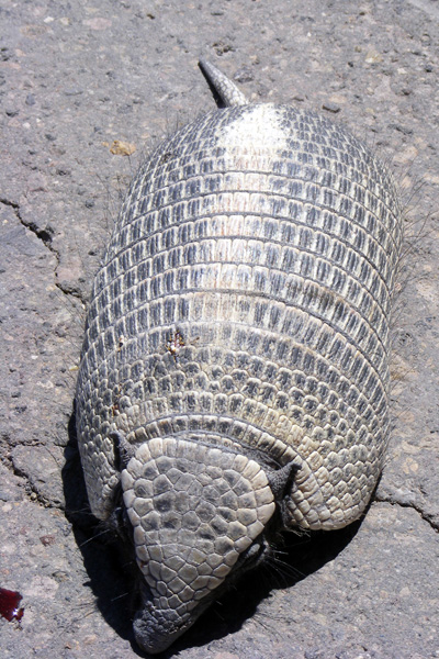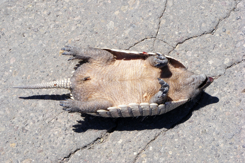 Konni drehte nach meinem Unfallbericht natürlich sofort um und konnte es nicht unterlassen, ein Aktenfoto des verunglückten Unfallopfers zu machen. Ich nenne das Leichenschändung – Konni Beweisfoto. Den ganzen restlichen Abend musste ich mir noch Witze darüber anhören, wie man das einzige Gürteltier weit und breit einfach so überfahren kann.