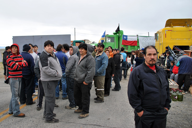 Wir wollten es trotzdem versuchen und bekamen auch ohne weiteres die Stempel in die Pässe gedrückt. Gemütlich rollten wir in Richtung Puerto Natales und stießen gute 7km vor der Stadt auf die besagte Straßenblockade. Hier standen ein paar Busse und LKW auf der Straße und versperrten die Durchfahrt. Ich blieb 20 m vor der Sperre stehen und zog den Helm ab. Eine 5-köpfige Delegation kam auf uns zu und erklärte die Situation.