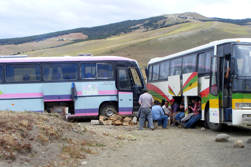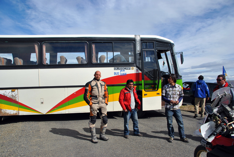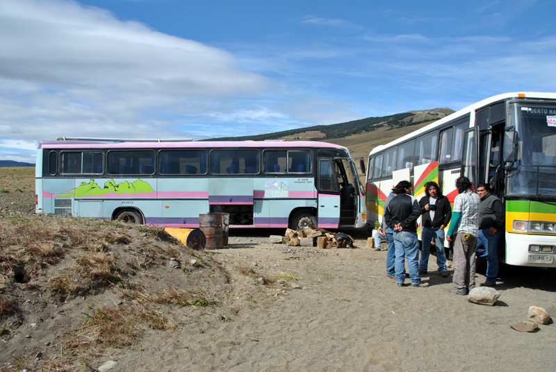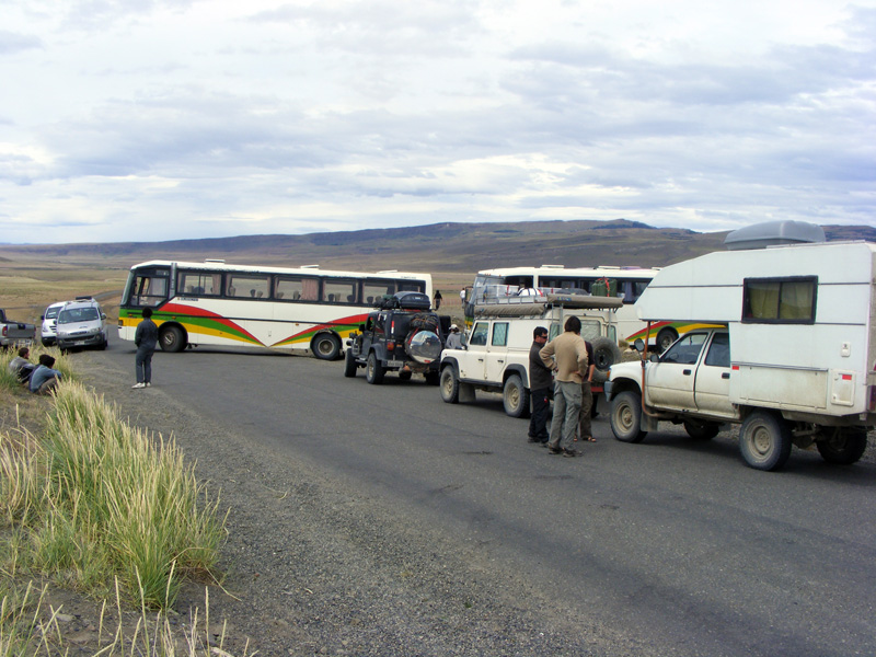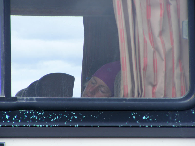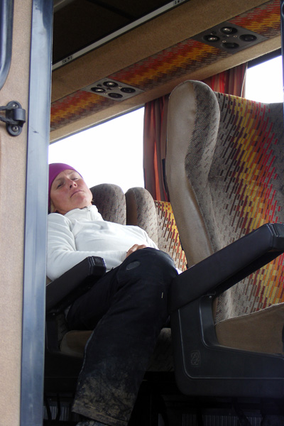 Nach 66 km war allerdings erstmal Schluss. Wir stießen doch noch auf eine Wegsperre und hier waren die Jungs unbestechlich. Es gab fuer uns erstmal kein Durchkommen. Also setzte ich mich demonstrativ in einen der Blockaden-Busse, stellte die Rückenlehne zurück und schlief eine Runde, schließlich war es im Bus wärmer als draußen.