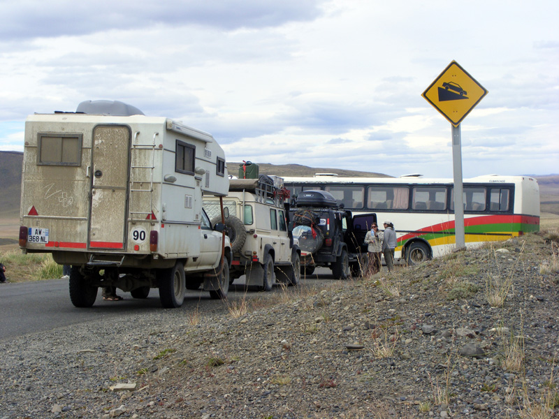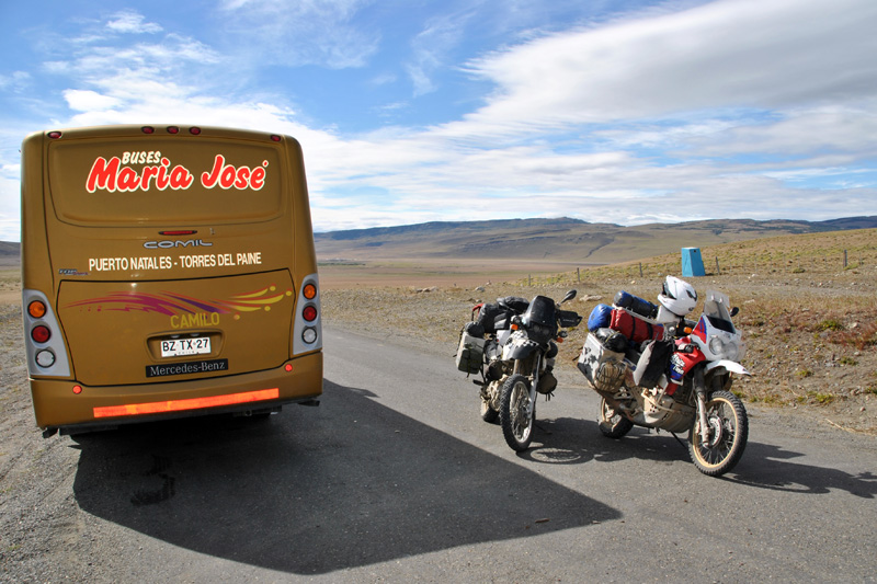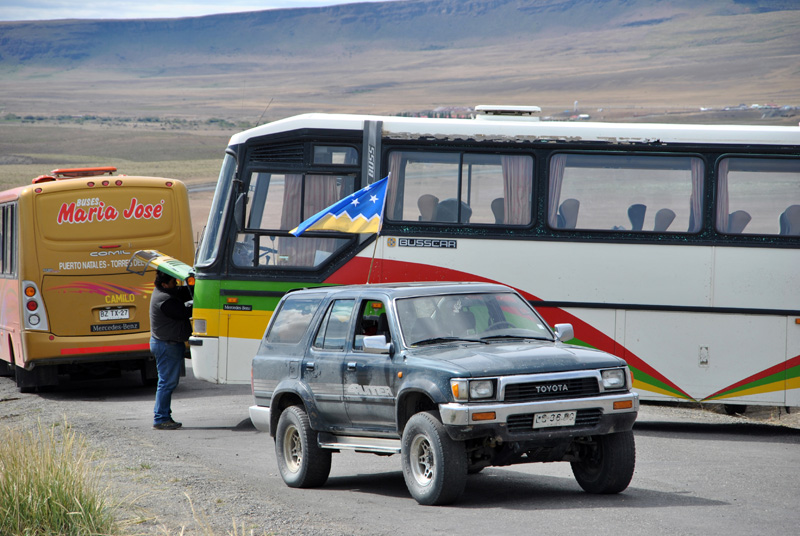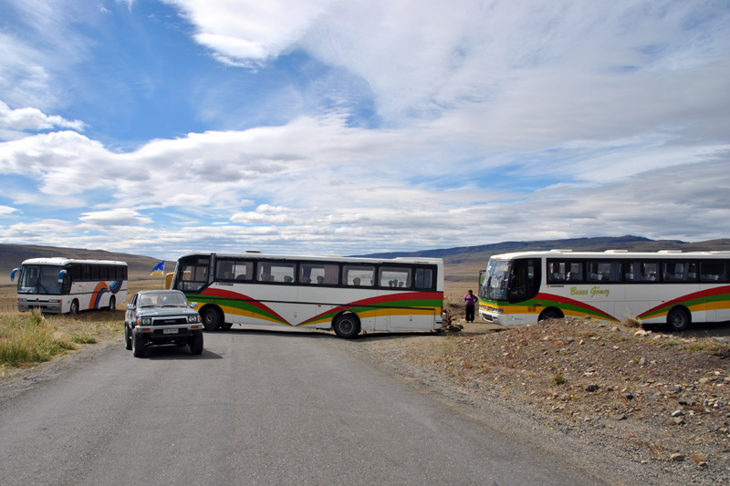 Etwas angefressen ging es zurück in Richtung Puerto Natales. Auf der Straße gabelten wir dann 3 Backpacker auf, die uns berichteten, dass Ihr Hotelmanager sie mit dem Auto bis hier her über eine Schotterstraße ausfahren konnte und der Weg für uns frei wäre. Ohne langes Überlegen bogen wir auf den Schotter ab und stießen nach 8km auf einen querstehenden LKW ohne Bewachung. Den konnten wir ohne Probleme seitlich passieren und die Zufahrt in den Nationalpark Torres del Paine war für uns gesichert.