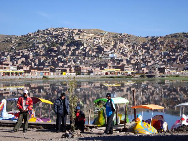 Freunde unserer Gastfamilie brachten uns nach Puno. Nach diesen tollen Tagen in einer Familie wurden wir fast von der Hässlichkeit dieser kleinen überschaubaren Hafenstadt erschlagen. Das einzig schöne an diesem Ort ist die Fassade der barocke Kathedrale an der Westseite der Plaza de Armas. In der restlichen Innenstadt buhlen Internetcafes, Restaurants und Klamottenläden um die zahlreichen Touristen.