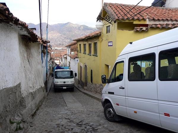 Als Fußgänger lebt man in Cusco recht gefährlich. Durch die Enge der Straßen ist man gezwungen, sich an die Hausmauern zu drücken, um nicht von einem Spiegel oder Kotflügel gestreift zu werden. Was die Autofahrer nicht im geringsten interessiert.