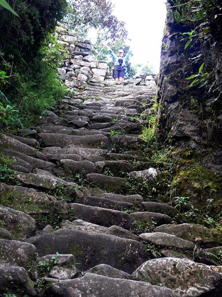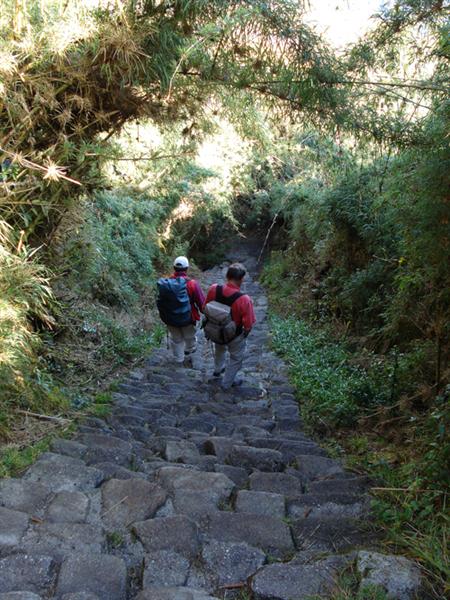 Da wir einen Tag zuvor mehr Wegstrecke zurückgelegt hatten, konnten wir heute länger schlafen. Wir gingen den Tag extrem gemütlich an und jeder spürte die Wehmut des Anderen. Es wurde an diesem Morgen nicht viel gesprochen, denn jeder wollte seinen eigenen Gedanken nachgehen. Im Schneckentempo begaben wir uns auf den Weg. 4000 Treppen bergab, da hat man eine Menge Zeit um nachzudenken und sich seelisch moralisch wieder auf Zivilisation vorzubereiten. Die Sonne stand hoch am Himmel und mit jeder Treppe nach unten wurde es wärmer. Die Blumen zeigten sich in ihrer vollen Pracht und die ganze Gruppe wurde noch langsamer, was schon schier nicht mehr ging. Stehen bleiben wäre die nächste Stufe gewesen. In mir schlugen 2 Herzen. Eines wollte so lange wie möglich diese Augenblicke genießen und das Andere wollte so schnell wie möglich nach Machu Picchu.