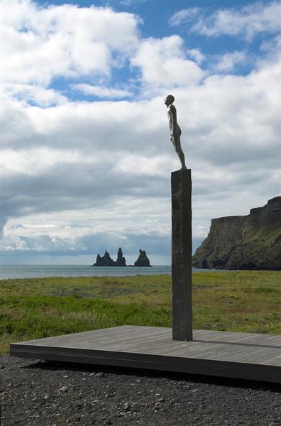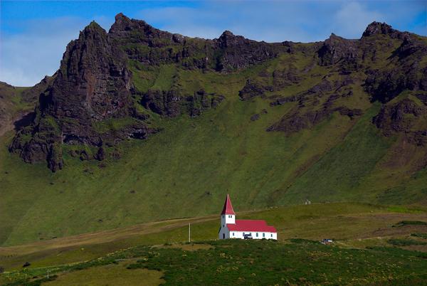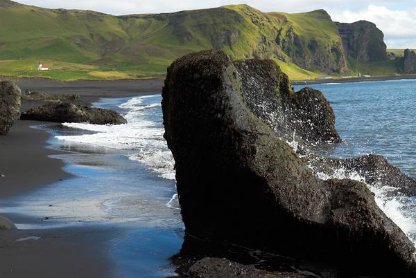 Doch mein Weg führte mich dann doch weiter in die winzige Oase Vik. Am Strand setzte ich mich in den warmen, tief schwarzen Sand und ließ mir den Wind um die Nase wehen. Am Westende des Strandes ragt die Felsengruppe Reynisdrangar wie drohende Finger aus dem Wasser. Als ich so am Strand saß erblickte ich die kleine Kirche, welche auf einem Hügel stolz über dem Ort ragt. Ich beschloss, die Kirche zu besichtigen. Dieses kleine Gotteshaus glänzt mit schönen, schlichten Buntglasfenstern in zackig geometrischen Formen. Im Inneren der Kirche hörte man den Wind, der ständig stärker wurde. Ich setzte mich auf eine Kirchenbank und ließ das Alles auf mich wirken. Mich überkam eine bisher unbekannte Ruhe und irgendwann dachte ich mir, hier ist der liebe Gott zu Hause. Mit einem Lächeln verließ ich die Kirchen und fuhr weiter.