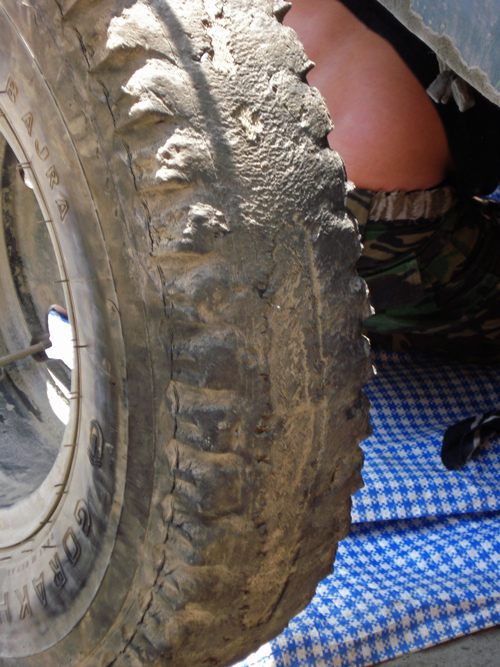 Als wir um eine Kurve schossen, verloren wir fast ein Kleinkind, welches in der Nähe der Tür stand. Kurz darauf ein lauter Knall, ein Schlingern des Vehikels – Plattfuß hinten links.