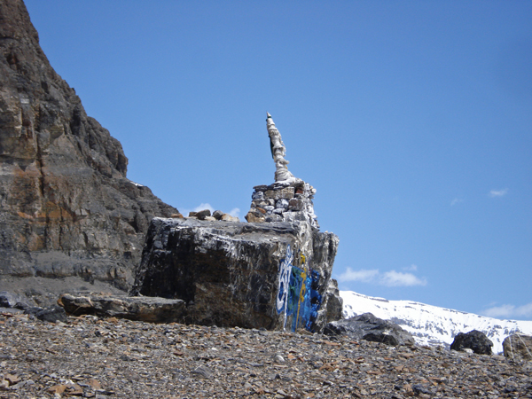 Die recht kurze Strecke nach Losar bewältigten wir ohne Gepäck. Der Weg ging immer leicht ansteigend am Flussbett entlang und rechts und links standen von der Sonne skurril geformte Schneeskulpturen.