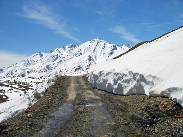 Durch die Schneeschmelze waren einige tiefe Wasserpassagen zu bewältigen und manchmal wurde die Straße von mächtigen Schneebrettern sehr verschmälert.
