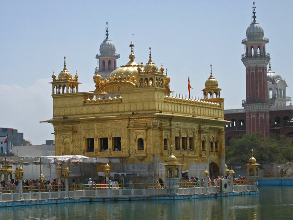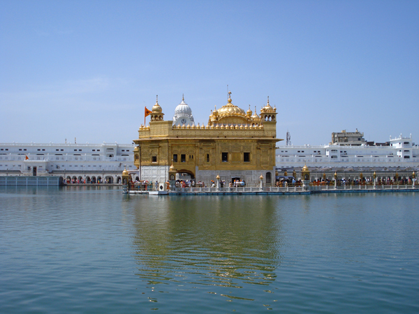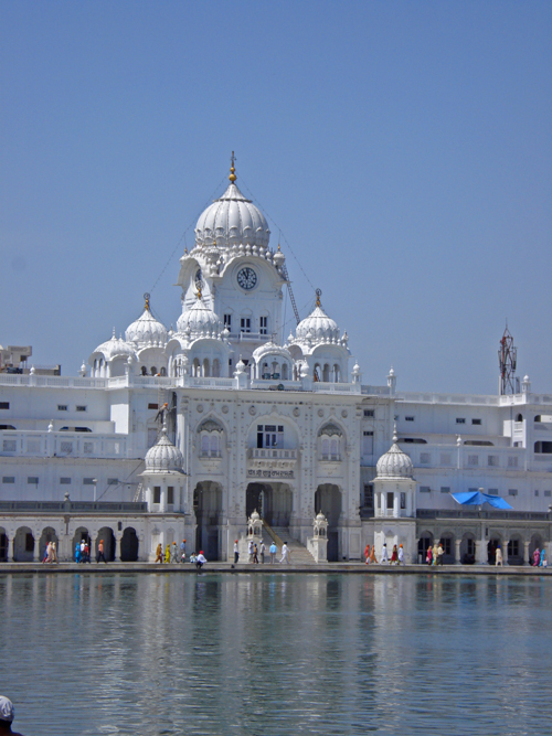 Nachdem wir artig wie wir sind unsere Schuhe abgegeben und unsere Häupter mit einem Tuch bedeckt hatten, watschelten wir barfuß mit 1000 anderen Menschen im Uhrzeigersinn auf blank poliertem Marmor um den Tempel, der inmitten eines künstlich angelegten Sees steht.