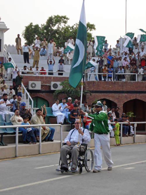 Als der Fahnenträger dann auch noch einen Rollstuhlfahrer auf die Straße schob, diesem die Fahne in die Hand drückte und ihn bis an die indische Grenze brachte, war der Applaus und das Getobe ohrenbetäubend.