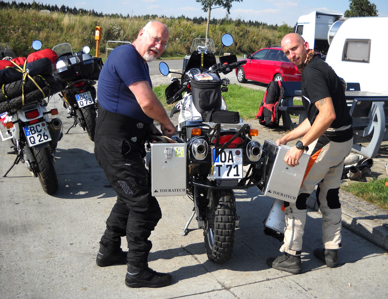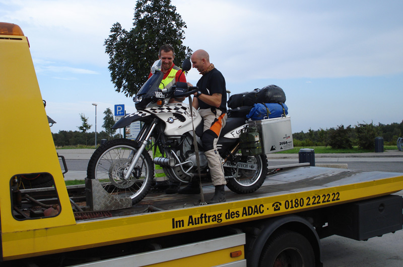 Nach kurzer Beratung stand fest, dass es viel zu gefährlich sei so weiter zu fahren. Somit kamen die gelben Engel zum Einsatz. Das Motorrad wurde Huckepack nach Dresden auf den Campingplatz gebracht.