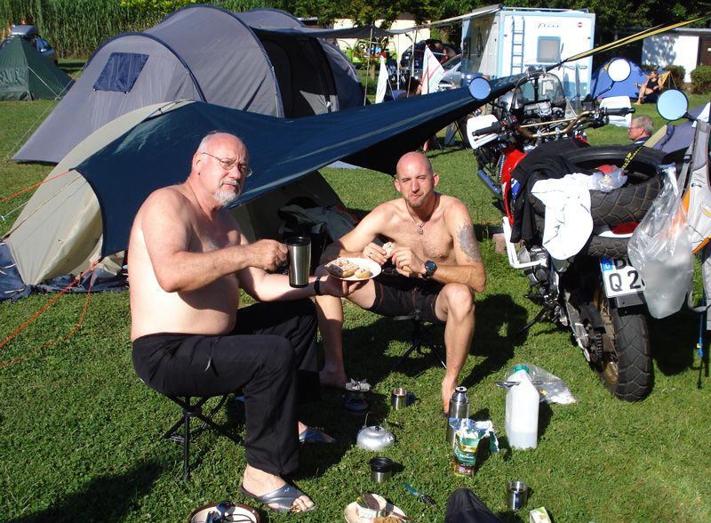 Der arme versuchte im strömenden Regen sein Zelt aufzubauen. Das konnte doch kein Mensch mit anschauen, daher packten wir gleich mit an. Wir stellten allerdings sofort fest, dass dieser Biker hier noch nie zuvor ein Zelt aufgebaut hatte und so stand der dann nur noch daneben, während wir seine Schäfchen ins Trockene brachten.