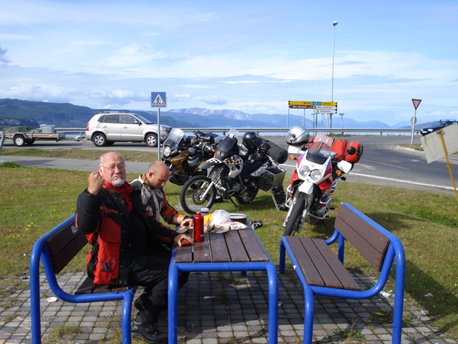 In Alta stachen mir ein Tisch mit zwei Bänken in die Augen, welche auf einem schön gepflegten Rasenstück standen. Kurzerhand hielt ich drauf zu und stellte den Motor ab. Während Konni den Einkehrschwung ohne Ecken und Kanten mitfuhr, tuckerte Paps an unserem Rastplatz vorbei und musste im Verkehrsstau umdrehen.